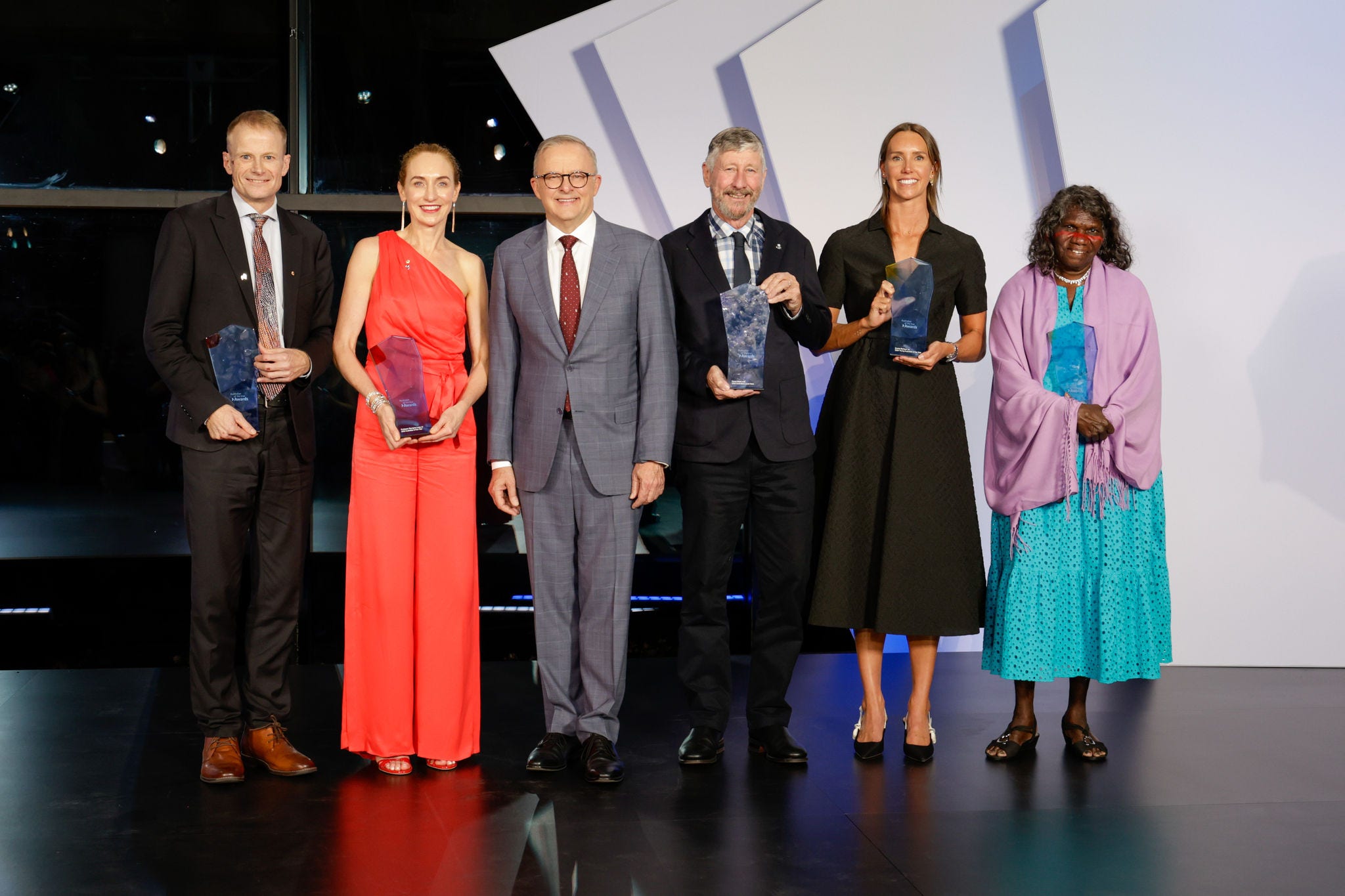 Prime Minister Anthony Albanese presented the Australian of the Year Awards to (L-R) Professor Richard Scolyer, Professor Georgina Long, Australia’s Local Hero - David Elliott OAM, Young Australian of the Year - Emma McKeon and the Senior Australian of the Year award to teacher, linguist and community leader, Yalmay Yunupiŋu. Photo thanks to the National Australia Day Council with Salty Dingo.